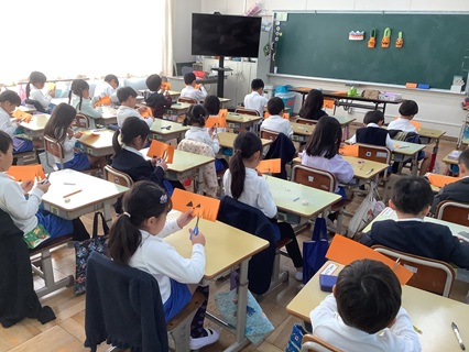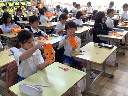10月30日(木)1年生が図工の時間にハロウィンの飾りを作っていました。廊下を通ると教室に誰もいないのかなと思うほどの静けさ、教室の中をのぞくと、みんな全集中ではさみを使って切り込みを入れているところでした。顔も描いていましたが、それぞれに個性が出ていて、とてもかわいかったです。子どもたちは、おうちへ持ち帰るのを楽しみにしながら作っていました。