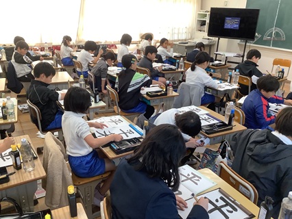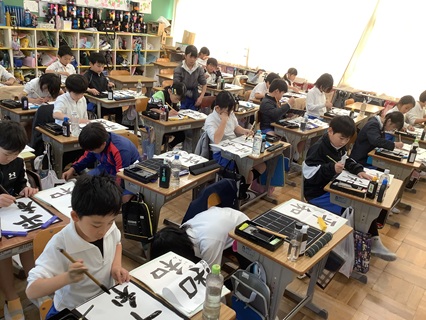 11月20日(木)4年生が書写の時間、習字で「平和」という課題に取り組んでいました。教室に近づいていくと、あまりの静けさで、だれもいないのかと思うほどの全集中の子どもたちの姿がありました。今日は、清書ということで、納得いく作品を仕上げようとがんばっていたのだと思います。真剣な姿、すてきでした。