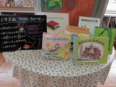 図書室の休み時間のオープン再開に合わせて、先生たちのおすすめ本コーナーが更新されました。今回は5年生の先生お2人です。