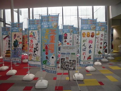昨日、サオリーナへ行ってきました。新聞等で報道されていましたが、とこわか国体・とこわか大会に向けて、47都道府県の応援旗がお披露目されたというので見に行ってきたのです。津市内の小中学校の有志が昨年度に製作したのですが、本校からも図工クラブが2県を担当しました。