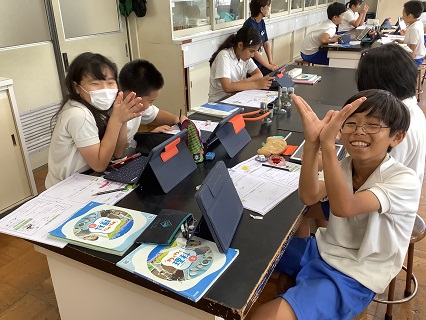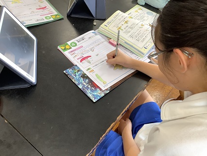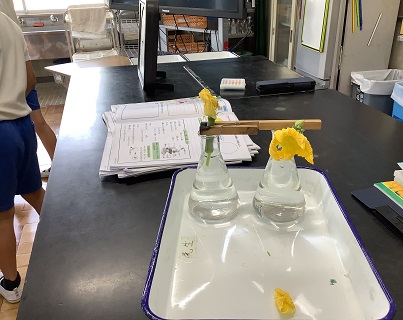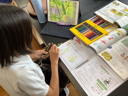 9月5日(金)5年生が理科の時間にへちまの花の観察をしました。へちまのおばな、めばなの花のつくりはどうなっているのか、ちがいはどこかをよく見て、絵に表していました。しっかり観察し、細かいところまで丁寧に表現しようとがんばっていました。中には、手のひらを使って、めばなとおばなのちがいを説明してくれる子もいました。たくさんの花が咲き、へちまの実ができてきています。花から実がなるようすもぜひともしっかり観察してほしいと思います。