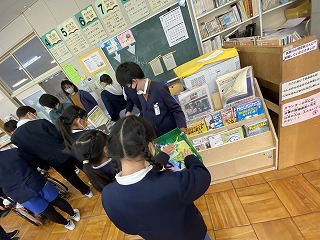 ヒントに沿って探します。どこかな、どこかなー?ワクワクしますね。 あった!これです。「見つかってよかったね」「いい本を見つけたね」など、図書委員は声掛けの仕方についても勉強中です。