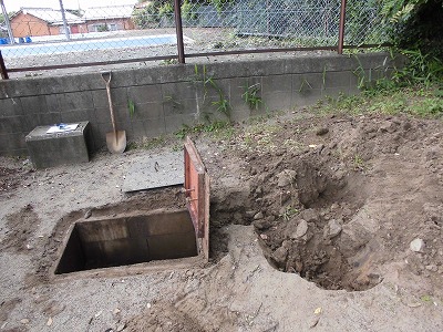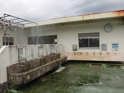 プール水泳は中止ですが、できる範囲で清掃をしようということでプール関係の水道が使えるよう開栓してもらいました。私たちではできませんので、水道局の方が二人も来てくださっての作業です。