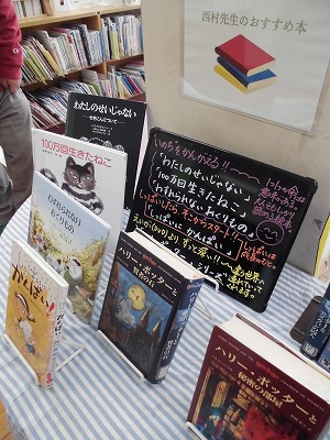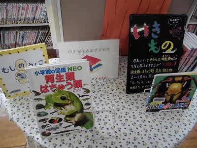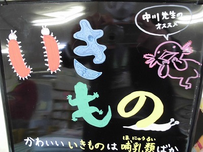 今日は図書室に関する情報が満載の日です!①特設コーナー『春』 春が待ち遠しい、そんな気持ちのこもったコーナーです! ②特設『西村先生のおすすめ本』コーナー 古川司書も「すごい!温かさの中にも鋭さが感じられますねぇ」とうなる選書です。名作ぞろいです! ③特設『中川先生のおすすめ本』コーナー 「さすが中川先生!」と誰もが納得する本の数々です! 本もさることながら、もう一つの注目はブラックボードの字のデザイン。『いきもの』が『いきもの』でできているのに気づきましたか? アップでどうぞ! ※さすが、プロです! |