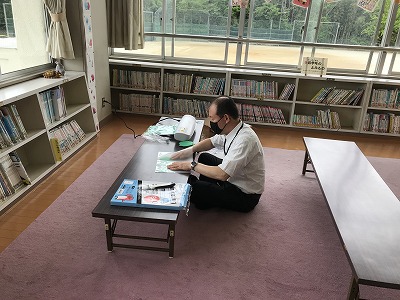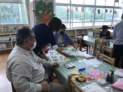 今日は図書館ボランティアの方が集まってくださり、図書館のかざりを4月の春から5月の新緑の季節へと模様替えをしていただいていました。