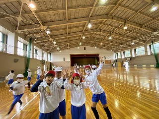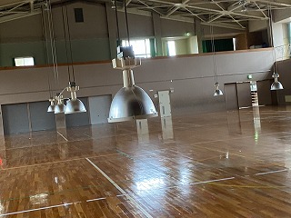 うわー、明るくなった! これでしっかり体育ができるね! この体育館は学校開放事業で毎日いろいろな団体が使っています。皆さんにも安全に使ってもらえますように。 |