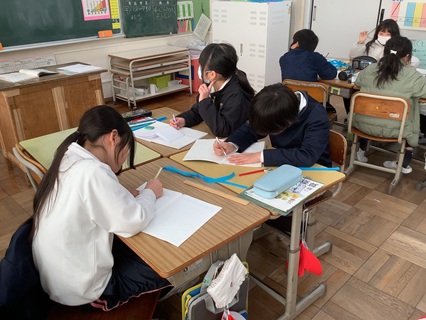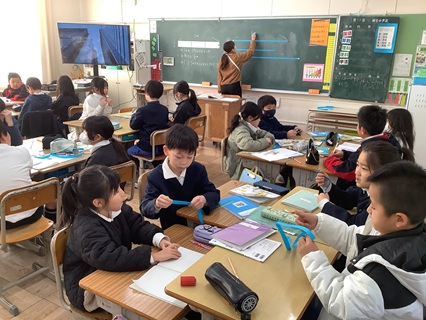 1月14日(木)3年生が算数で「分数」の学習をしていました。3分の1という数について考えていました。実際に紙テープを使って、3分の1を作って考えます。「1」をもとにして考えるということがよくわかったようです。授業の最後のふりかえりは、どの子も自分の言葉で、わかったことを一生懸命書いていました。再度、黒板を見てふり返り考えを書いている子もいました。わかったこと、わからなかったこと、次に考えたいことなどを授業の最後にふり返ることで、次の学びへとつなげていきます。