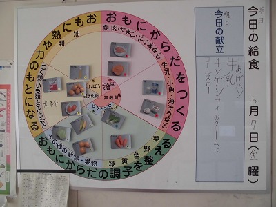 メニューのヒントはこちら。毎日、給食委員会のメンバーが掲示してくれている給食ボードです。