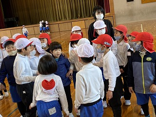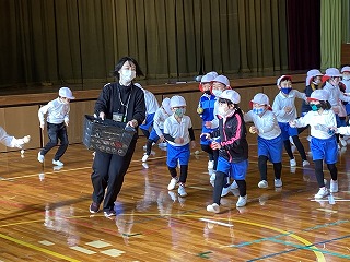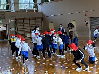 1年生は体育で玉入れをしました。設置されたかごに入れるのではなく、担任の先生がかごを持って動き、そこへ走って入れに行く、というもの。いっぱい走って楽しそうでした! 校区に住む、いなば特別支援学校に通う友だちを交えて、一緒に楽しみました。