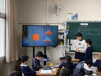 斜めに折ったり、縦に折ったりするなど、子どもたちは自分の考えた方法を、テレビ画面を通じて発表していました。