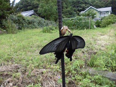 クロアゲハの羽化に遭遇!羽の裏面のきれいな赤斑を撮影しようとした瞬間、飛び立ってしまいました。残念!