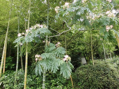 頭上には 合歓の木(ねむのき)の優しい薄ピンク色の花が!