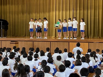 児童会役員のみんなが劇をしながら、夏休みの生活で気を付けることを伝えてくれました。テーマは「早寝早起き」「ゲームをする時間を決めること」「家に帰る時間」です。どこが悪かったか、についてみんなに考える場面をつくるなど、とても工夫してある内容でした。
