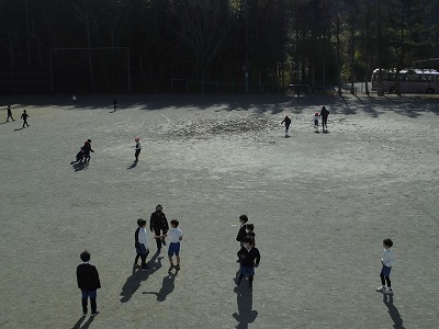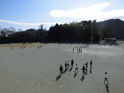 連日、朝の冷え込みで、運動場の一部が凍るという現象が起こっています。写真は25日(水)のものです。日があがるとともに、凍ったところが溶け、ぬかるんできます。 そこに足を踏み込み、地面がぐちゃぐちゃになった様子が見て取れると思います。 ぐちゃぐちゃに荒れた部分とその周辺の太陽が反射している部分が、凍るところです。その他の場所はノープロブレム! その違いは何かというと、塩化カルシウムの効果です。凍結防止の散布効果がてきめんに表れています! 散布してくれたスポ少野球:高岡コンドルズさんに感謝です!(実は、この凍る部分ですが、先日のドクターヘリが下りた場所なんです。推測ですが、風圧で砂とともに塩カルも吹き飛んでしまったものと思われます。次回の購入で再度散布してみようと思います。) こちらは、元気に遊ぶ子どもたちの姿です。(20分休みと昼休みで、低学年と高学年を交代制にして運動場を使用しています。密を避ける工夫です!) |