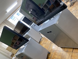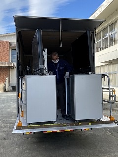 おやつカンパニー松田社長様からの寄贈があり、通常学級のテレビは新品になり、それまで使っていた12台は多目的室で保管してありました。津市教育委員会でそれらをどこに分配するか決めていただき、今朝から業者の方に搬出をしていただきました。トラックで2回運んでいただきました。