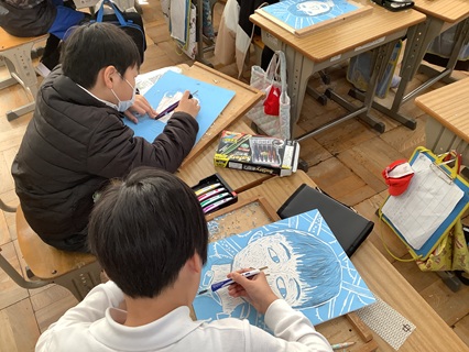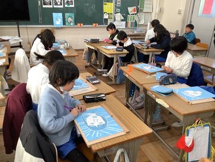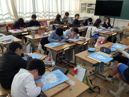 2月17日(火)4年生が図工で版画をしています。どの学年もいろいろな素材や技法を使って版画を学習しますが、4年生では、初めて彫刻刀を使って木版画をします。彫刻刀の使い方を教えてもらい、けがをしないように気を付けて、慎重に彫り進めていました。ついつい刃の前に手を持っていってしまいがちになるのですが、時々、先生や友だちから手の位置について声掛けがあり、はっとしている子もいました。完成に近づいてきています。木版画の風合いは、とても味があっていいものです。印刷するのが楽しみです。