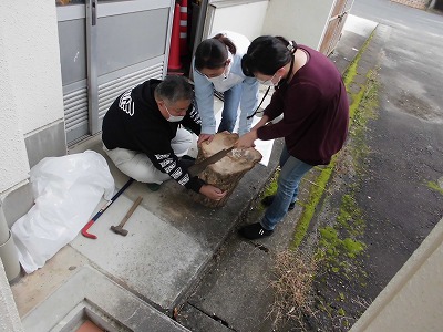 図書ボランティアの方々が、通常なら図書室に集まってこられるのですが、今日は違っていました。渡り廊下横の楽焼室前に集合されていたのです。