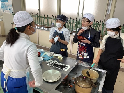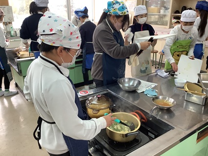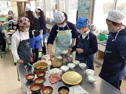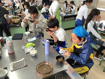 12月12日(金)5年生が家庭科の時間に調理実習をしました。ご飯と味噌汁を班で協力して作りました。煮干しからだしをとって作りました。味噌汁の具は、あげ、大根、ねぎです。班のみんなで作業を分担し、最後の片付けまでがんばっていました。廊下まで、いいだしの香りがしていました。ぜひ、おうちでも子どもたちに作ってもらってください。最高においしいご飯と味噌汁がいただけると思います。