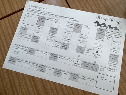 すごろくのマスで、「グループ全員で校長先生のところに行き、新年のあいさつをする。」というのがあり、いくつかのグループが、ニコニコ笑顔で「あけましておめでとうございます」を言いに来てくれました。