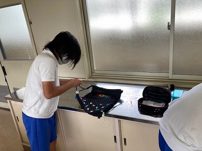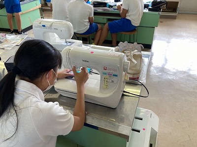 6年生が家庭科室でナップサックを作っていました。