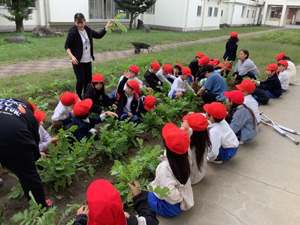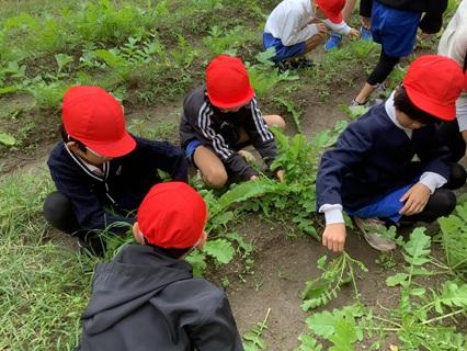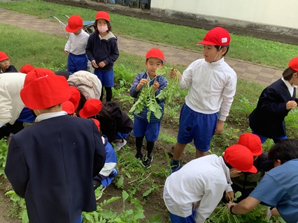 10月24日(金)2年生が校内の畑で大根を育てています。この日は、青々と葉っぱが茂ってきているので、間引きをしました。こんな元気な葉っぱを抜いてしまっていいものかと躊躇している子どもたちでしたが、1本の大根を大きく育てる意味を知り、勇気を出して引き抜いていました。これから大きくなるのが楽しみです。