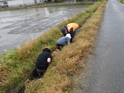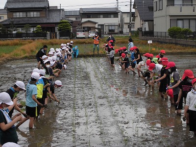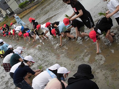 田んぼの両端から張っていただいた糸に付けてある目印に合わせて、自分の守備範囲3~4か所に苗を植えます。全員が植えると、40㎝ほど後ずさりして、動かしてもらった糸の目印に合わせてまた植えることになります。その繰り返しです。 何回か繰り返すうちに、植えるのはみるみる上達してきました。おぼつかないのは、後ずさり。中には尻もちをついてSOSの発出も! 雨も止んで、みんな大喜びで作業を進めていきます。地域の方からも、「ようなってきた」とお褒めの言葉が! 頑張った後は、泥を落とさなければなりません。たらいやバケツに水を用意していただいていたのですが、それだけではおっつかず、用水路で洗うグループも! 仕事の大変さをかみしめる一場面でもありました。 最後に、今後の田んぼの管理について説明を受けました。9月の稲刈りが楽しみです! 準備やご指導等、本当にお世話になりました。今後もよろしくお願い致します。みんなで感謝の気持ちをお伝えし、帰路につきました。 学校へ戻ってきて、きれいに洗っているところです。お家の方には、たくさんの洗い物のご協力をお願いすることになります。すみませんが、よろしくお願い致します。 |