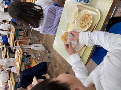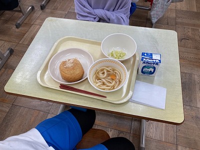 今日の給食は、きなこのあげパン、鳥南蛮うどん、キャベツの甘酢づけ の三品でした。 朝、ろうかで会った子が「今日はあげぱんやな~」と声をかけてくるほど、子どもたちが楽しみにしているメニューです。