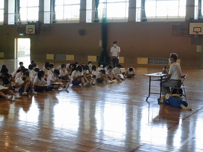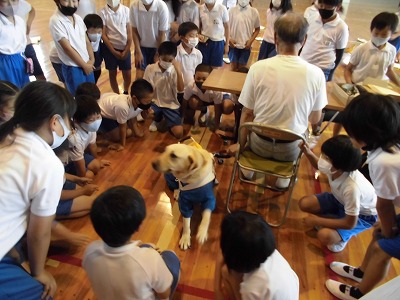 デュークと内田さん。担任団と今日の内容の最終確認です。 さあ、会場の体育館へ。デュークは学校訪問が初めてということで、少し落ち着かない様子とのことでした。 本来なら、もっと距離を縮めて、ふれあい感を出しながらお話を聞きたいところなのですが、現状では、これが精いっぱいかな~。 休憩タイムには、この通り! 質問やら間近で見つめるやら、子どもたちの心にはどんなふうに響いたでしょう。 「校長先生、メモいっぱいとったもんで、見て、まっ黒!」 差し出した手に、考えさせられたことが多かったということや頑張りが見て取れました! |