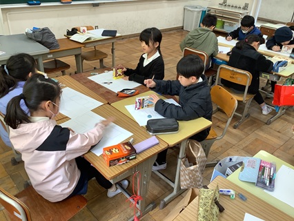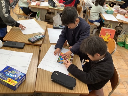 3月4日(水)2年生が算数で「はこの形」を学習していました。この学習では、身の回りにある箱の形をしたものを観察したり、構成したり、分解したりする活動を通して、頂点、辺、面に着目し、立体図形の特徴をとらえることがねらいです。子どもたちは、それぞれがおうちから持ってきた箱を使って学習を進めていました。箱の面を紙に写し取り、どんな形か、いくつ面があるかを調べていました。友だちと協力して、面の形を写し取っている姿がすてきです。