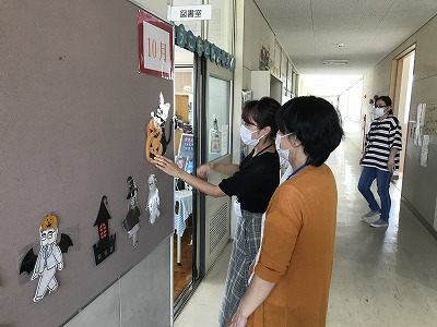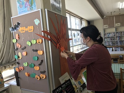緊急事態宣言中、図書館ボランティアの活動もお休みで、図書室の掲示が夏のままでした。緊急事態宣言が解除され、図書館ボランティアの活動も再開です。