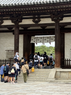 最初の見学地は、法隆寺です。バスの中でガイドさんの説明もよく聞き、現地でもしっかり見て、メモもしっかりとっています。
