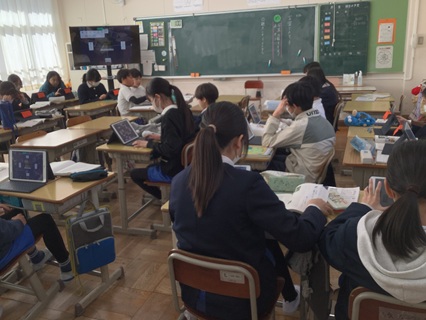 1月21日(水)5年生が国語「言葉でスケッチ」の学習をしていました。目にうつるものを言葉にして伝えるとき、相手に情景まで伝わるように、言葉を使って描き出すスケッチをしようという学習です。1枚の写真をよく見て想像を広げ、観点にそってメモに書き出していました。写真から想像したことを言葉にすることがスイスイできる子、言葉でどうやって表現しようかと迷っている子といろいろでした。友だちのメモも参考にしながら、タブレット端末を使って、一生懸命メモを作っていました。これから、そのメモをもとに、表現を工夫して文章にしていきます。