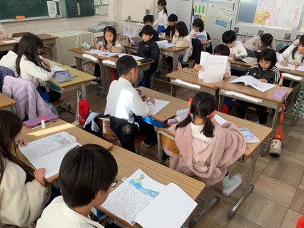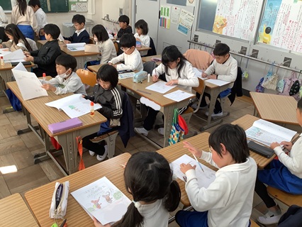 12月17日(木)2年生が国語「お話のさくしゃになろう」の学習で一人ひとりが作ったお話が完成しました。そのお話をまわして、読み合っていました。そして、おもしろかったことやよかたことなど感想を書いていました。友だちがどんなお話を作ったのか、自分とは違う発想におもしろさを感じた子もいるでしょう。みんなからの感想がもどってきてそれを読むのも楽しみだと思います。みんなすてきな作家になりました。