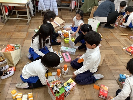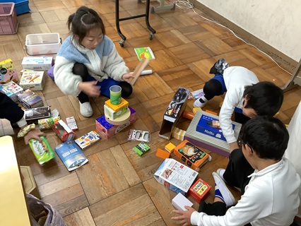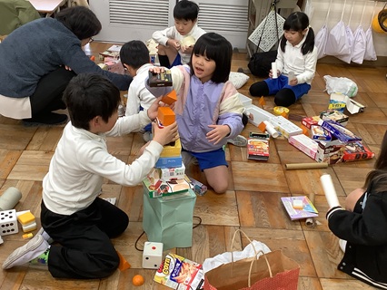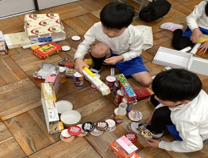 12月15日(月)1年生が算数「はこのかたち」の学習をしていました。ながしかくの形がある箱、さいころのようにましかくの形がある箱、つつの形など、いろいろな箱の形を学習してきました。学習がひととおり終わったということで、今日は、おうちから持ち寄った箱を使って、いろいろなものを形づくって、楽しんでいました。子どもたちの発想力の豊かさに感心します。遊びながら楽しく学んでいました。