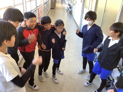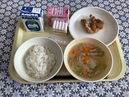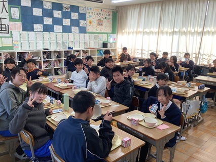 12月19日(金)2学期最後の給食でした。今日の献立は、牛乳、麦飯、白菜スープ、フライドチキン、クリスマスケーキです。普段は、なかなか出ないケーキに大喜びの子もたくさんいたようです。余りの出たケーキやフライドチキンは、ジャンケン大会でおかわりをいただいていました。