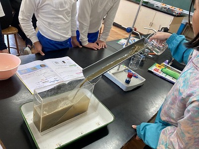 水のはたらきで地層ができることを確かめる実験ですね。