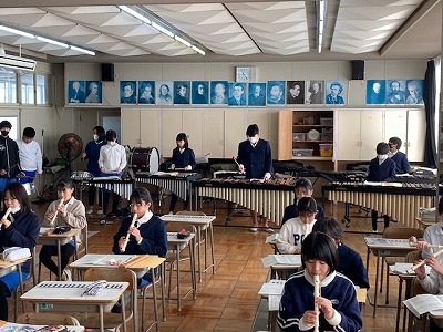 リコーダー、木琴、小太鼓、シンバル、バスマスターなどいろいろな楽器にチャレンジです。 一人一人、楽譜通りに正しく演奏することとメトロノームの「カチ、カチ・・・」という音に各楽器が合わせることの両方に気持ちを向けながら、がんばっていました。