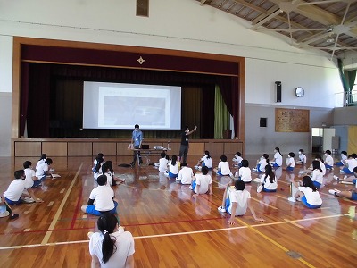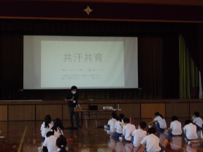 5年生。働く人々の思いを知る学習の一環で、コスモス作業所の方からお話を聞かせていただきました。コスモス作業所はどんな所で、どんな方たちが働いているのかなどを教えていただきました。例年なら、訪問して触れ合いながら学ぶところですが、今回は映像や実際にやっている仕事の生産物を見せていただいたのです。工夫満載で伝えてくださいました。 障がいがある仲間と一緒に働く中で気づいたことを2点、熱く語ってくださいました。①「感情労働」・・感情をコントロールすることの大切さを知り実行することで、自分自身の成長を感じる ②「共汗共育」・・同じ仲間としてともに汗を流して働き、ともに育っている 私たちが、この取組で子どもたちに感じとってほしいと願ってることを、ズバリと伝えてくださいました。他にもいっぱいステキなお話がありました。吸収して、力にしていきます! |