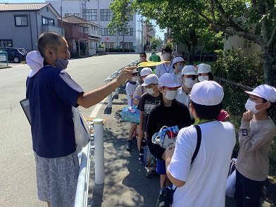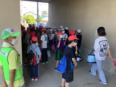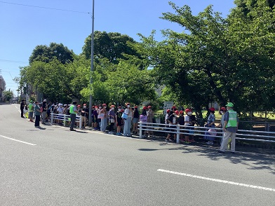 6年生もワクワクしている様子でした。バスに乗車するため学校から三角公園まで徒歩で移動しました。移動の道中は、地域学校協働活動の取組として、保護者や地域の方々に見守っていただきました。ありがとうございました。