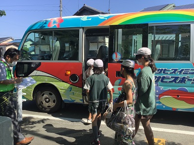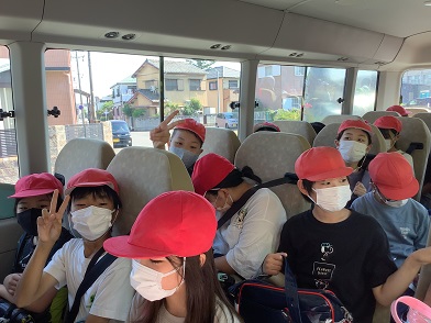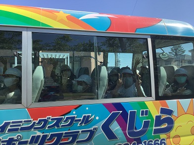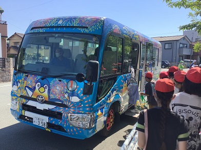 三角公園に到着して間もなく1台目のバスが来たので、さっそく乗り込みました。時間差で、2台目3台目のバスも来て、子どもたちは乗り込みました。