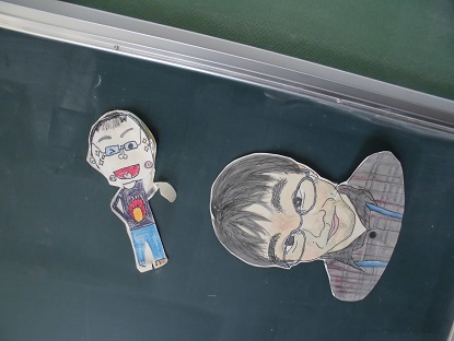 この似顔絵、以前担任した子どもがプレゼントしていってくれたものだそうです。さあ、この先生は誰でしょう? お茶目なところを表現した1枚と、かっこよく描き上げてくれた1枚!
