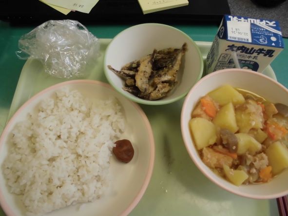 今日の給食のお話を、ぜひお家で話題にしてみてください。今日のメニューには、梅干しが出ていました。お昼の放送では、雨の時期と梅の実がなる時期とが重なることから梅雨ということや、保存食の梅干しのことが紹介されていました。