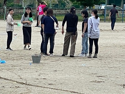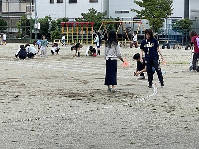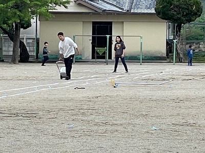 運動会練習に向けて、放課後に教職員で作業を行いました。ポイント打ちやライン引きなど、運動会用のトラックを整えました。