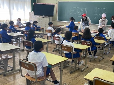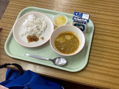 今日は、1年生にとって初めての給食でした。メニューは、カレーライス・福神漬け・手作りミカンゼリー・牛乳でした。準備をしている間、静かに待つことができました。また、配膳が終わると、マナーを守って食べ、最後は、片付けのルールを守って上手に片付けていました。