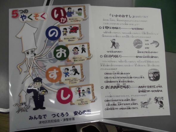 5限目、津警察の方に来ていただき、1年生を対象に誘拐防止教室をおこないました。まずは、いかのおすしについての説明です。ご自分で描かれた漫画キャラクターの絵を用いて説明してくださったのですが、その絵がプロ級にうまい! 加えて、お話もひきつけかたのうまいことといったら!