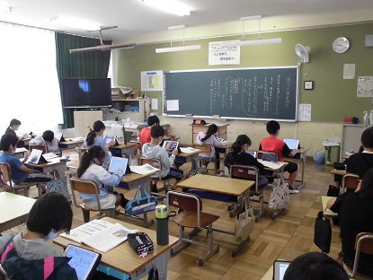 写真は、タブレットを活用し、シートに考えを記入しているところです。こうやって、生き方を自分に問うていくという学習を積み重ねています!