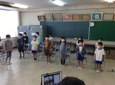 学級委員に任命される児童は会議室に集まり、他の児童は教室からオンライン配信(Zoom)でその様子を見ました。
