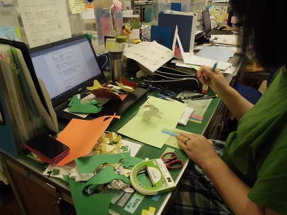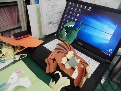職員室で黙々と作業をしている先生たちの手元をのぞいてみました。「ポップカード?」と尋ねたところ、「そうです!子どもたちの興味をひけたらと思って・・」という返答!