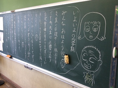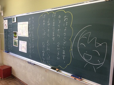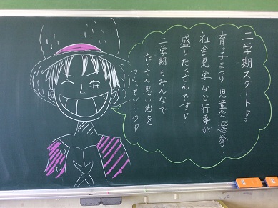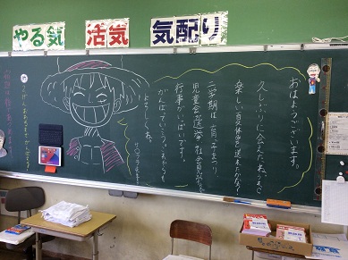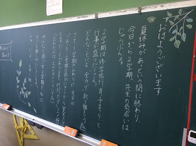 今日から二学期が始まりました。朝各クラスを回っていると、先生たちからのメッセージが黒板にたくさん書かれていました。イラストが描かれているものもあり、今日から始まるんだという気持ちが伝わってきました。