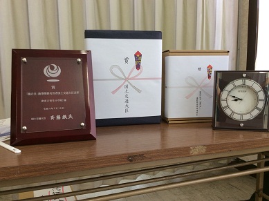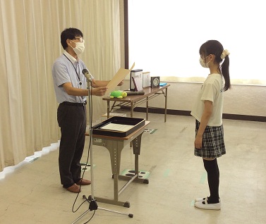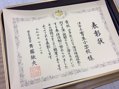 8時50分から表彰式と始業式があり子どもたちは教室からオンライン(Zoom)でその様子を見ました。表彰式では、育生小学校の長年にわたる海岸の清掃活動等が評価され国土交通大臣表彰をいただきました。授与のために来校してくださった市教委の先生から、児童の代表が表彰状と記念品を受け取りました。